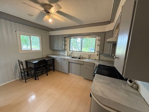 Welcome to this charming 760 SF bungalow located in a desirable, family-friendly neighborhood. It is perfect for first-time buyers or downsizers seeking comfort and potential. The bright and airy main floor features a spacious open concept living and dining area with natural light from large windows. The kitchen boasts a ceiling fan, updated countertops and backsplash, and comes fully equipped with all appliances. Two cozy bedrooms and a 4-piece bathroom with new flooring complete the main level. Downstairs, the unfinished basement offers a laundry room with washer and dryer included and ample space for a future rec room, office, and second bathroom, ready for your personal touch. Enjoy peace of mind with a brand-new hot water tank and gas forced air furnace. Outside, the partially fenced yard provides room to relax or garden. This home comes with potential and opportunity at an affordable price. Don’t miss your chance to make it yours! Yr-1955 Taxes-$1995